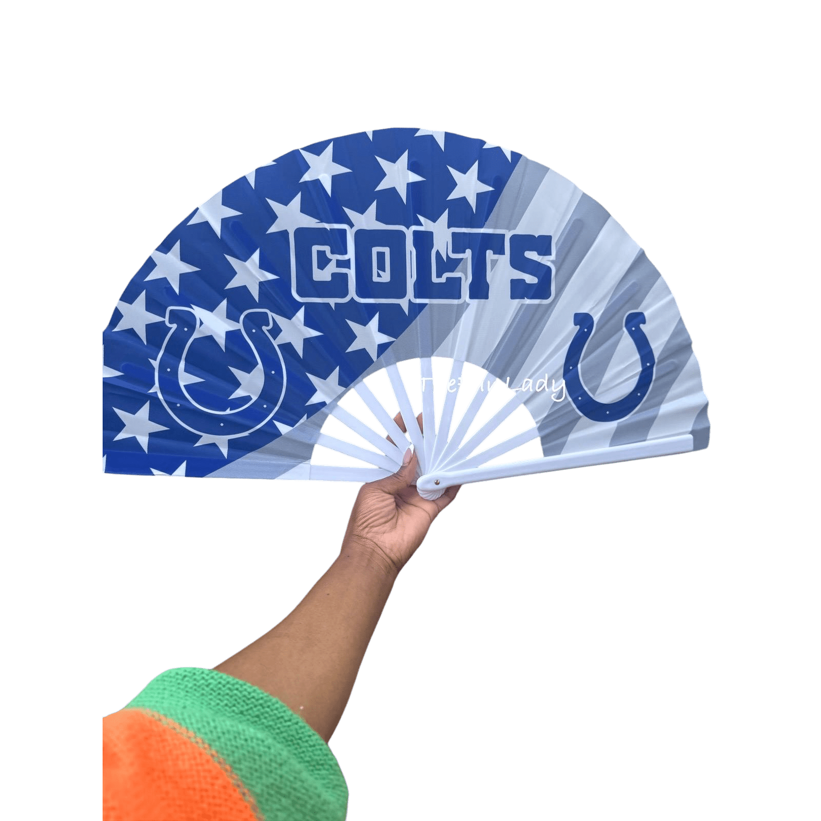 Cheer on the Indianapolis Colts in unforgettable style with this bold folding hand fan! Featuring the team's classic blue and white colors with striking star accents and the iconic horseshoe logo, this fan lets you CLACK your Colts pride loud and clear.